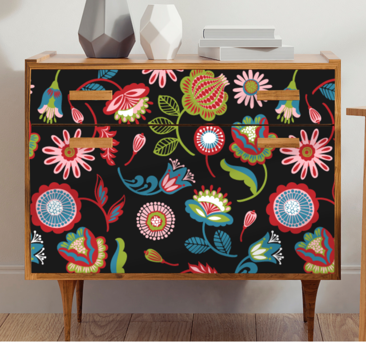 Sveiki atvykę į mūsų pasiūlymą – Dekoratyvinis lipdukas gyvybingas gėlių raštas, kuris puikiai įsilies į jūsų namų interjerą. Šis unikalus dizainas, išsiskiriantis gėlių motyvais, liaudies elementais ir spalvinga gamtos estetika, suteiks jūsų baldams gyvybės ir šilumos. Tai ne tik dekoratyvinis akcentas, bet ir puikus būdas išreikšti savo asmenybę bei stilių!