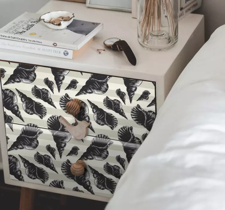 Susipažinkite su mūsų Gyvūnų lipduku kriauklės raštu – unikaliu ir elegantišku namų dekoru, kuris puikiai tinka bet kokiam interjerui. Šis nuostabus dizainas apima baldus, apvalkalą, kriaukles, jūros kriaukles, juosteles ir gamta įkvėptus motyvus, kurie sukuria harmoningą juodai baltą kompoziciją, suteikiančią jūsų erdvei išskirtinumo ir rafinuotumo!