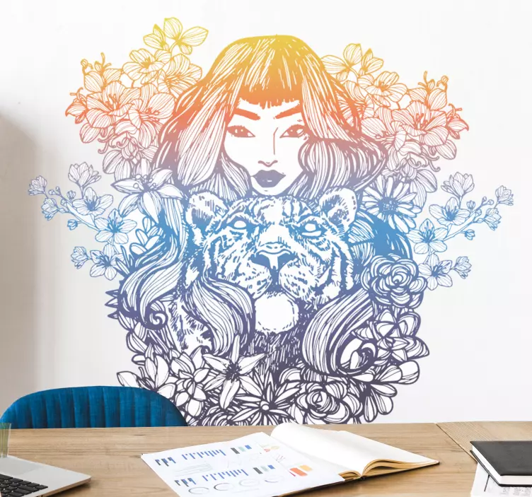 Susipažinkite su mūsų unikaliu Gyvūnų lipduku moteris su tigru, kuris sujungia meninį piešimą su ryškiomis gėlių kompozicijomis ir drąsiomis spalvomis. Šis lipdukas puikiai atspindi moteriškumą ir gamtos grožį, o linijinis piešinys su tigru ir žydinčiomis gėlėmis suteikia interjerui nepakartojamą charakterį. Gradientinės spalvos ir subtilios detalės leidžia šiam lipdukui tapti puikiu akcentu bet kuriame kambaryje!