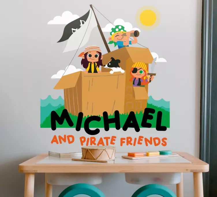 Informacija: A48764Gyva scena, kurioje vaikai apsirengę piratais laivo iš kartono, su burėmis ir žaismingu šunimi. Dizainas atspindi vaikystės vaizduotės ir nuotykių esmę, puikiai tinkantis sukurti linksmą atmosferą vaiko erdvėje.