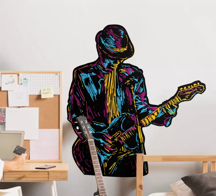 Muzikinis lipdukas spalvingo gitaristo siluetas yra puikus pasirinkimas dekoruojant jūsų namus, studiją ar koncertų salę. Jo gyvybingas dizainas ir spalvinga estetinė išvaizda suteikia šilumos ir energijos bet kuriai aplinkai. Pasirinkę šį muzikinį lipduką, jūs ne tik papuošite erdvę, bet ir sukursite muzikos atmosferą, kuri įkvėps visus aplinkinius. Leiskite muzikai kalbėti už jus!