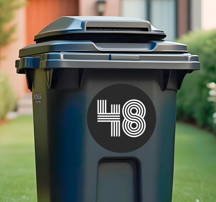 Gaukite šį dizainą ir mėgaukitės visais skirtingais elementais, kuriuos galite naudoti, kad pakeistumėte šiukšlių konteinerių išvaizdą. Tai yra ne tik paprasta dekoracija. Išimdami šiukšles pamiršite apie painiavą. Šis produktas atrodo puikiai ir yra tikrai naudingas. Lengvai atpažinkite savo konteinerį ir atskirkite jį nuo kitų tos pačios spalvos. Dizainas turi apskritimo formą su juodu fonu, o skaičiai daromi baltomis ištisinėmis linijomis. Šis juodo fono lipdukas šiukšliadėžei su pasirinktiniu numeriu ir baltomis linijomis skirtas jums.