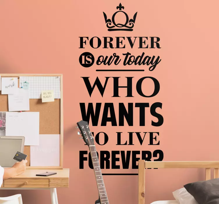 Tekstinis sienų lipdukas kas nori gyventi amžinai yra puikus pasirinkimas, norint į savo erdvę įnešti unikalumo ir įkvėpimo. Šis dizainas remiasi muzika ir dainų tekstais, kurie primena, kad gyvenimas yra vertingas ir turi būti gyvenamas pilnai. Su vienspalviu tipografijos sprendimu, jis ne tik papuoš jūsų sienas, bet ir suteiks erdvei gyvybės bei optimizmo.