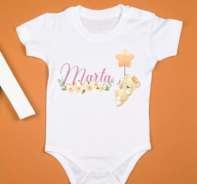 Informacija: T5219Šis žavus dizainas vaizduoja mielą lokį, laikantį žvaigždės balioną, papildytą subtiliomis gėlių detalėmis. Vardas 'Marta' elegantiškai įkomponuotas į meno kūrinį, sukuriant džiaugsmingą ir asmenišką akcentą, puikiai tinkantį kūdikių drabužiams.