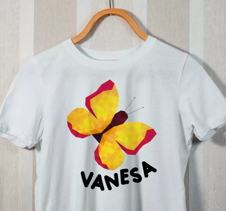 Informacija: T4993Šis žavus dizainas pasižymi ryškiu drugeliu, kuriame žėri geltonos ir raudonos spalvų derinys. Geometrinės formos suteikia modernų akcentą, o drąsus vardo rašymas sustiprina asmeninį žavesį. Puikiai tinka perteikti linksmas ir žaismingas nuotaikas.