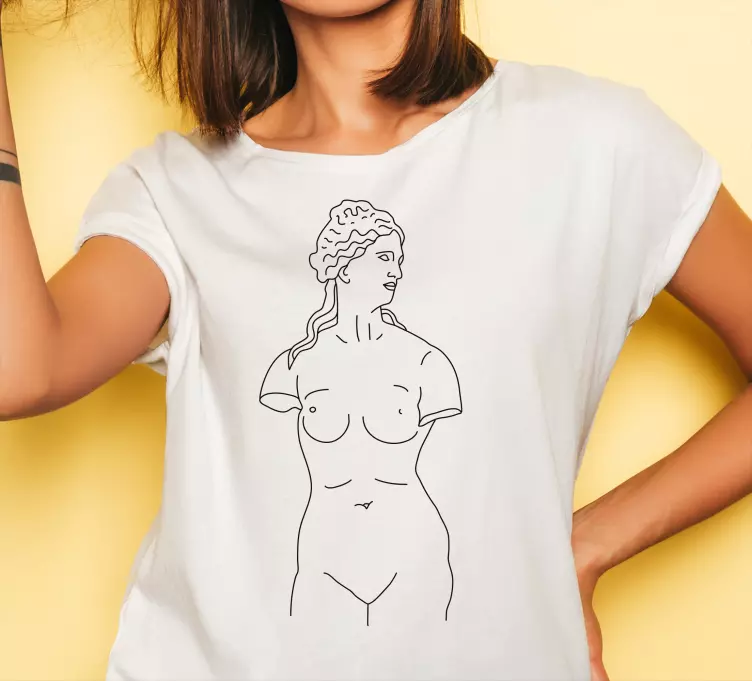 Marškiniai elegantiškai moteriškai siluetai – tai unikalus drabužis, kuris sujungia senovės graikų estetiką ir modernią madą. Jų dizainas, įkvėptas kultūrinio paveldo, primena statulą ir moters portretą, o linijinis piešinys suteikia jiems abstraktų ir menišką išvaizdą. Minimalistinis stilius ir modernios detalės daro šiuos marškinėlius puikiu pasirinkimu bet kuriai progai!