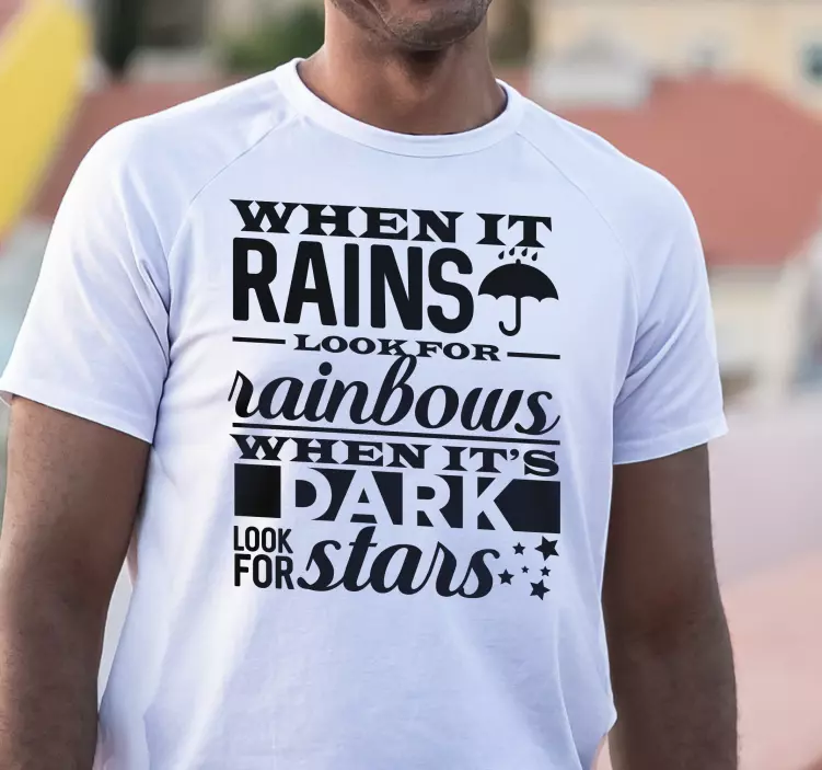Informacija: T4888Šis stilingas viršus turi pakylėjančią frazę, skatinančią teigiamą mąstymą. Dizainas sumaniai derina lietaus, vaivorykščių ir žvaigždžių vaizdus, todėl tai yra apgalvotas pasirinkimas tiems, kurie ieško motyvacijos sudėtingais laikais.