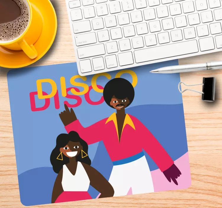 Jei norite pakeisti savo darbalaukio dekoratyvinį stilių, patikrinkite šį pelės kilimėlį. Tai pelės kilimėlis su originalia ir išskirtine šokančio 80-ųjų diskotekos žmogaus iliustracija su užrašu „disco“. Šis kilimėlis yra geltona ir rožinė spalva, tai spalvingas ir įdomus dizainas, kurio dirbdami ar atnaujindami galite atnaujinti savo studijos ar stalo dekorą. Studijuoti.