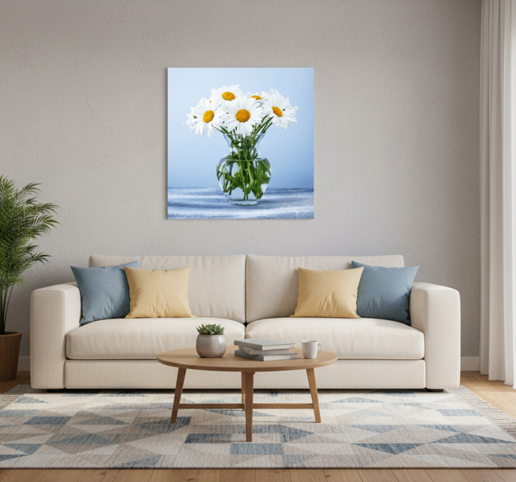 Plakatai svetainė margoji ramunė stiklinėse vazose Poster svetainė gali būti lengvai pritaikyti bet kokiam interjerui. Galite juos priklijuoti naudodami dvipusę lipnią juostą arba įrėminti, taip suteikdami jiems dar daugiau elegancijos. Eksperimentuokite su skirtingomis pozicijomis ir atspalviais!