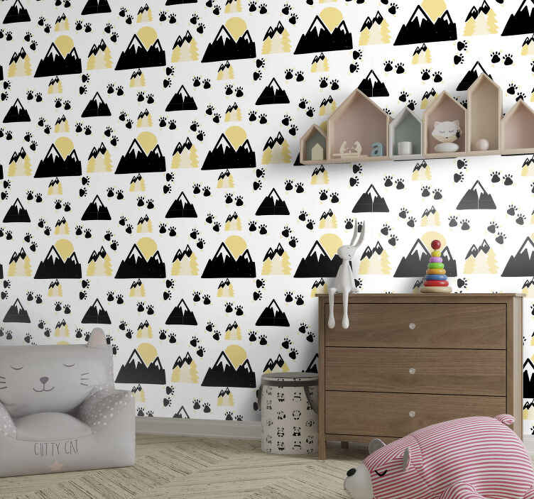 Dizainas šiame Kalnai ir šunų pėdsakai tapetai vaiku kambariui apima kalnus, pėdsakus, piešinį, modelį, letenų žymes, medžius, saulę, lauko temą, kurie suteikia išskirtinį ir nuostabų vaizdą.