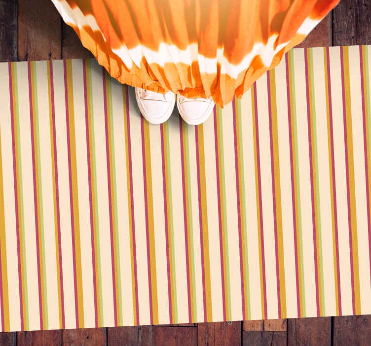 Pasinerkite į Dryžuotas vinilo kilimas daugiaspalvė elegancija, kuris išsiskiria savo unikaliu dizainu! Šis kilimas pasižymi vertikaliomis linijomis ir juostelėmis, kuriose subtiliai dera geltona, raudona, žalia ir smėlio spalvos. Jo modernus modelis suteikia elegancijos bet kuriai erdvei, todėl jis puikiai tinka tiek namuose, tiek biure.