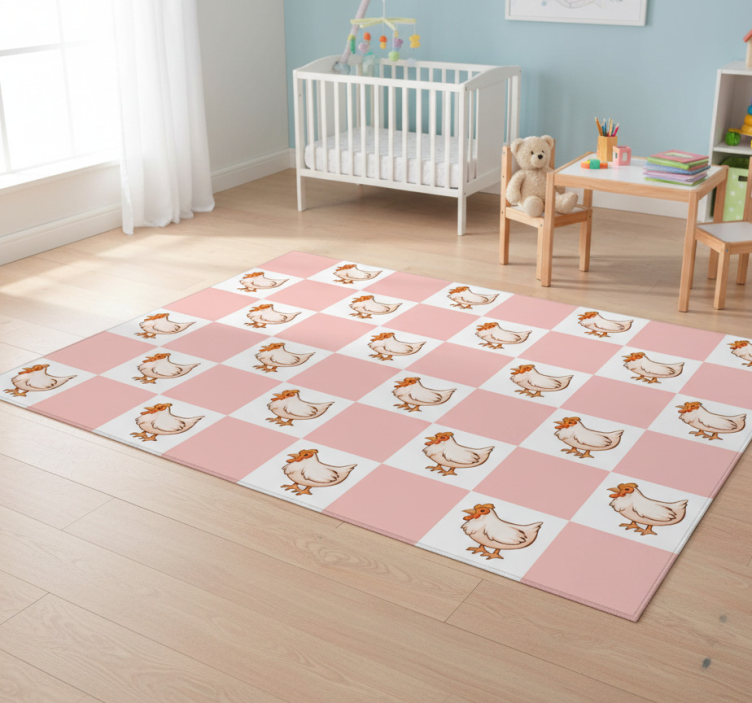 Gyvūnų vinilo kilimėlis rožiniais kvadratėliais su gaidžiais